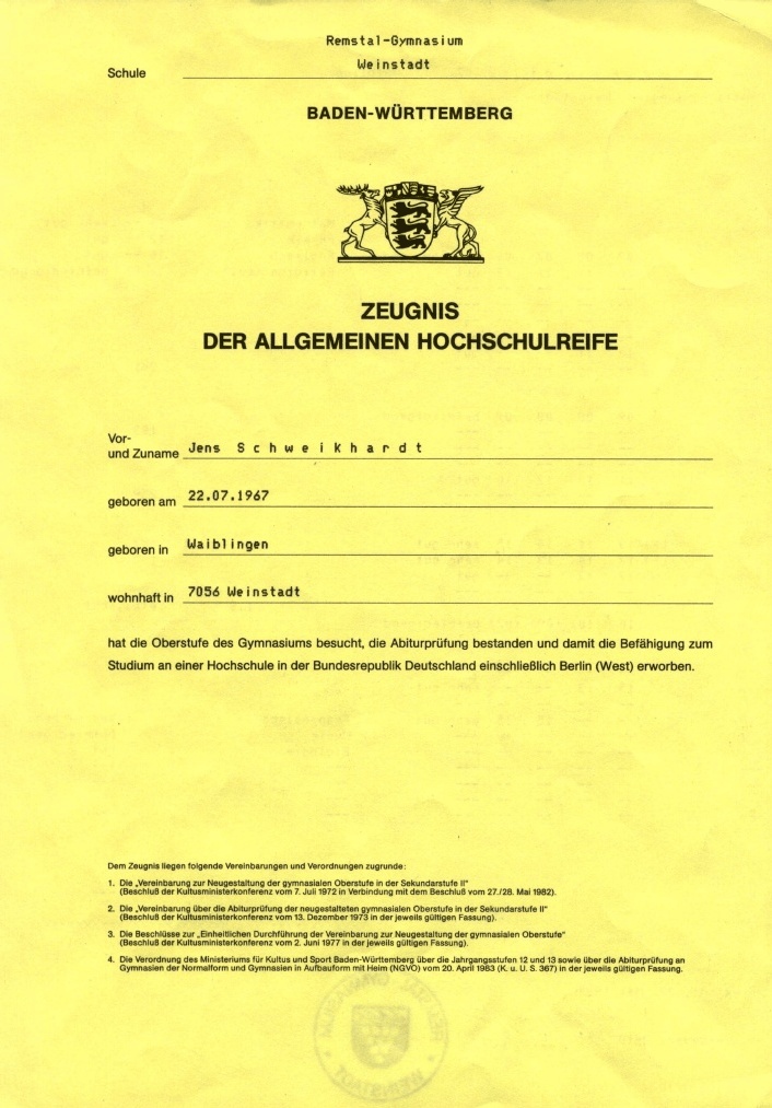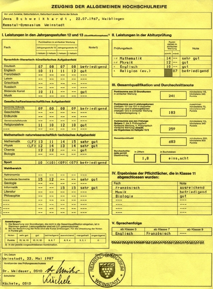 | 1978 | - | 1987 | Remstalgymnasium Weinstadt, Abitur März 1987, Note 1,8 (gescannt als 200K jpg Seite 1 und 370K jpg Seite 2) |