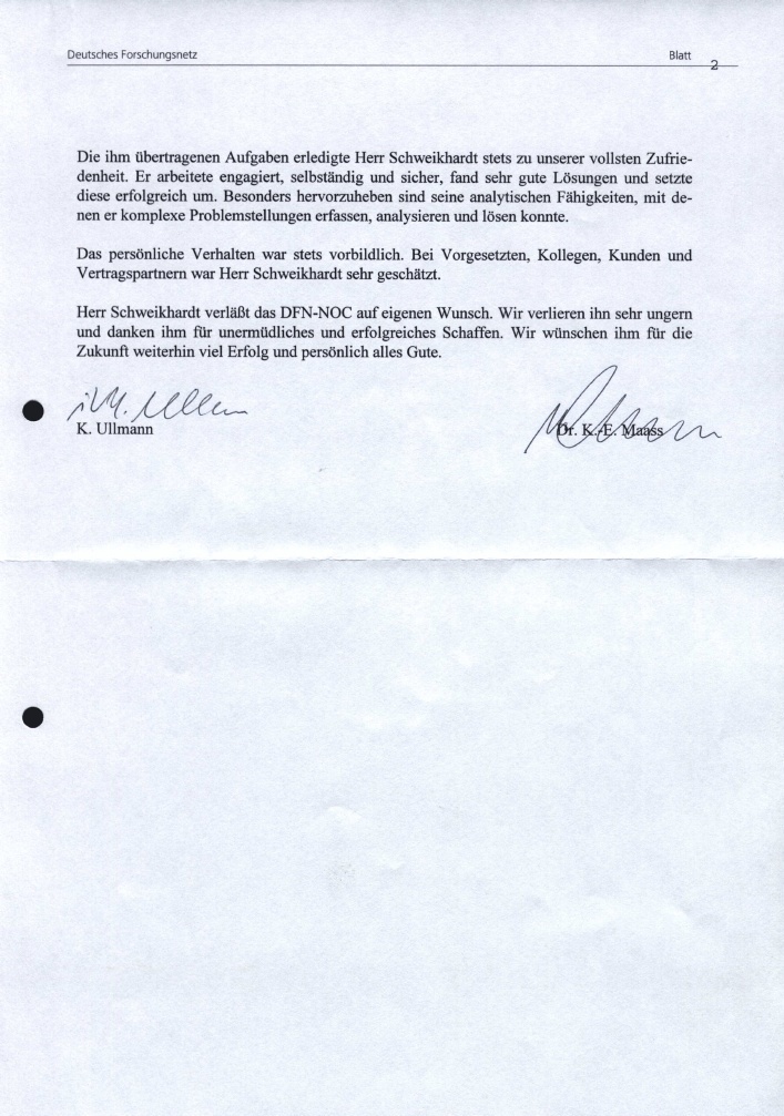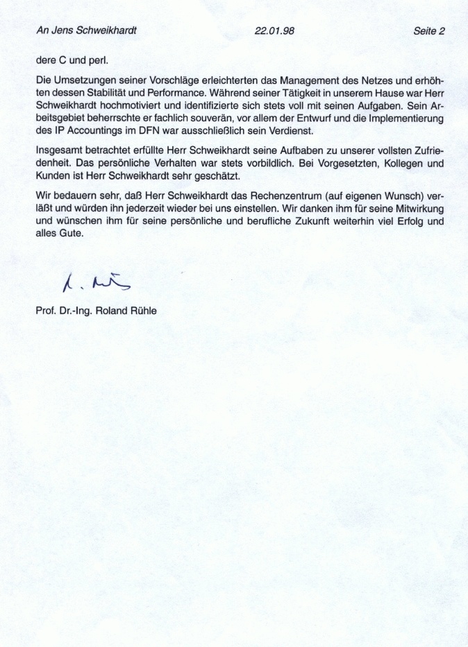 | 1/1998 | - | 12/2000 | Wissenschaftlicher Angestellter im Network Operation Center des Deutschen Forschungsnetzes beim DFN Verein (Arbeitszeugnis HTML Abschrift oder gescannt als 300K jpg Seite 1 und 230K jpg Seite 2) |