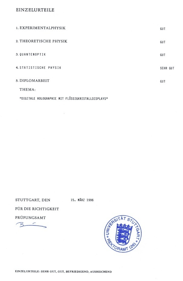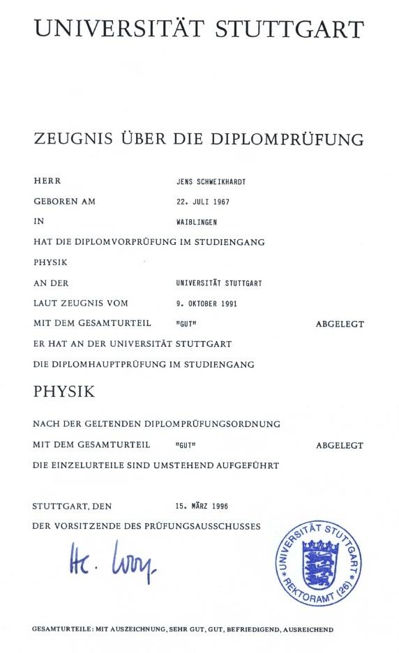 | 1989 | - | 1996 | Studium der Diplomphysik an der Universität Stuttgart. Abschluß: Diplom (Diplomzeugnis HTML Abschrift oder gescannt als 110K jpg Seite 1 und 50K jpg Seite 2) |