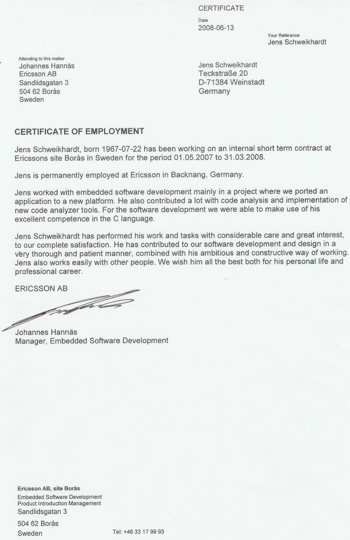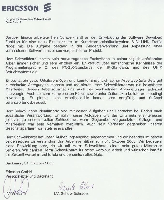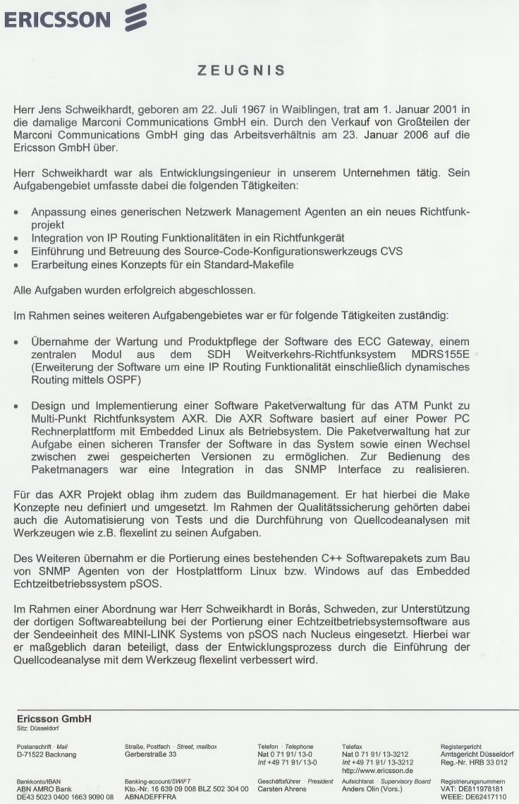 | 1/2001 | - | 10/2008 | Software-Entwicklungsingenieur für Richtfunk bei Ericsson Deutschland (bis zur übernahme 12/2005 Marconi Communications), Backnang (Zwischenzeugnis HTML Abschrift oder gescannt als 230KB jpg; Zeugnis, S.1 und S.2; Zeugnis der Entsendung) |